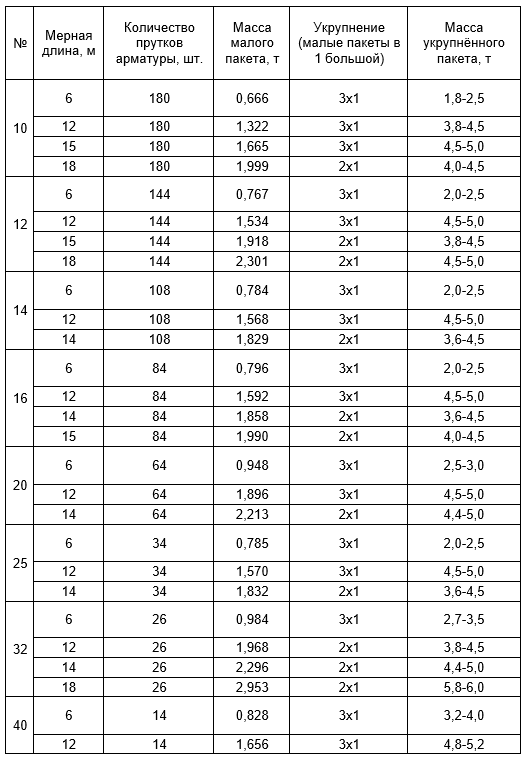 Пакет с двойной обвязкой катанкой не менее чем в 4-х местах. Масса пакета от 3,0 до 4,0 т без подсчёта прутков арматуры. Длина прутков арматуры от 6000 мм до 10000 мм. Пакет с двойной обвязкой катанкой не менее чем в 6-ти местах. Масса пакета от 4,0 до 6,0 т без подсчёта прутков арматуры. Длина прутков арматуры от 11000 мм до 24000 мм. Крайние обвязки пакетов располагаются на расстоянии не более 0,5 -1,0 м от обоих торцов пакета. Допуски на мерную длину: