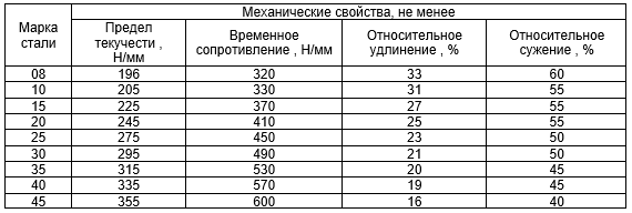 Примечание - По согласованию изготовителя с заказчиком для металлопродукции из стали марок 25, 30, 35, 40, допускается снижение временного сопротивления на 20 Н/мм, по сравнению с нормами, указанными в таблице, при одновременном повышении норм относительного удлинения на 2% (абс).